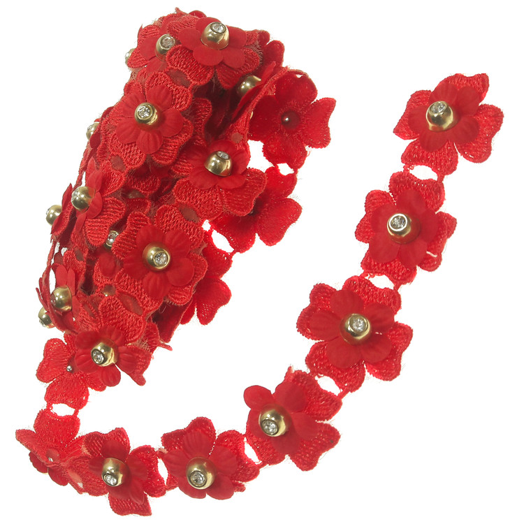 2 متر نوار قرمز نگین دار با عرض حدود 2.7 سانتی متر.حداقل 55 عدد گل در این متراژ وجود دارد که می توان به صورت تک تک یا نواری روی کار تزئین کرد.مناسب لباس مانتو کیف کفش و کارهای تزئیناتی و عروسک سازی