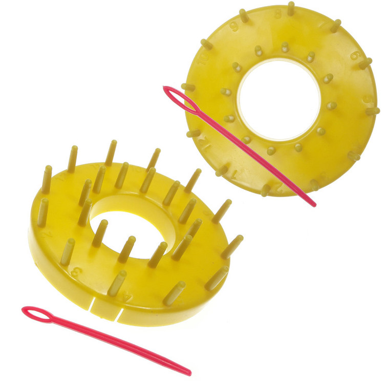 2 عدد کارگاه گرد موتیف به قطر 9 سانتی متر و ارتفاع 2.5 سانتی متر به همراه 2 عدد سوزن پلاستیکی.در مجموع 4 عدد(2 عدد کارگاه+2 عدد سوزن پلاستیکی)کارگاه بافت انواع گل با نخ قلاب کاموا و غیره.