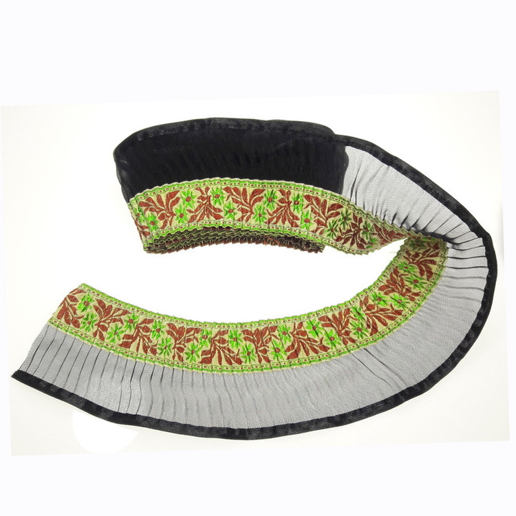 2 متر یراق پلیسه با عرض 7 سانتی متر حریر پلیسه مشکی و نوار پارچه ای به رنگ زمینه کرم روشن و گل سبز و آجری تیره .مناسب تزئینات لباس مانتو دامن و دکوراسیون سنتی و غیره