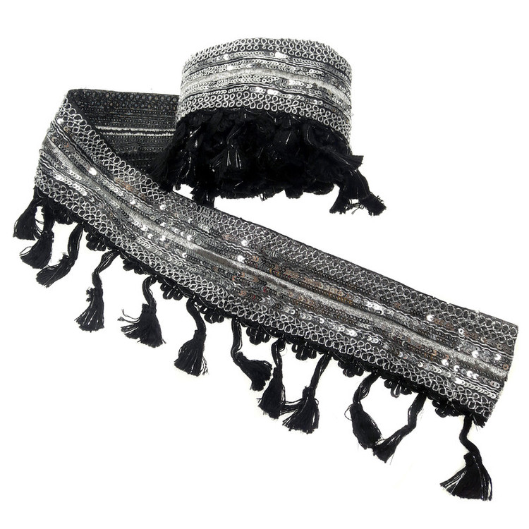 2 متر یراق مشکی نقره ای با عرض 9.5 سانتی متر.زمینه مشکی با پولک نقره ای و نخ لمه کار شده.مناسب کارهای مجلسی و دکوراسیون های سنتی و شیک