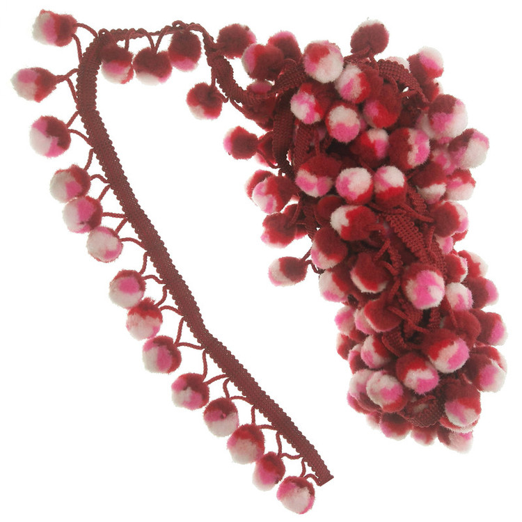 3.6 متر یراق پم پم منگوله ای با عرض حدود 3 سانتی متر.رنگ صورتی_قرمز.طرح و رنگ طبق عکس.مناسب تزئینات لباس مانتو و کارهای هنری.