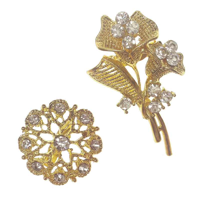 جزئیات: 2 عدد گل سینه یکی با ابعاد 2.7x4.6 سانتی متر و یکی با قطر حدود 2.5 سانتی متر رنگ نگین نقره ای رنگ بدنه طلایی.روش نصب با سنجاقی که در پشت گل سینه قرار داده شده.لطفا به ابعاد گل سینه ها دقت بفرمایید.