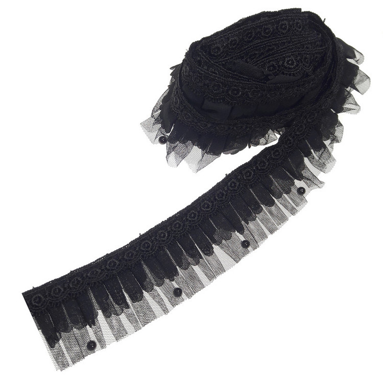 2.4 متر یراق مشکی با عرض 4.5 سانتی متر.لبه کار نوار گیپور به همراه پارچه تور و مروارید مشکی.مناسب تزئینات لباس دامن مانتو مجلسی و دکوراسیون