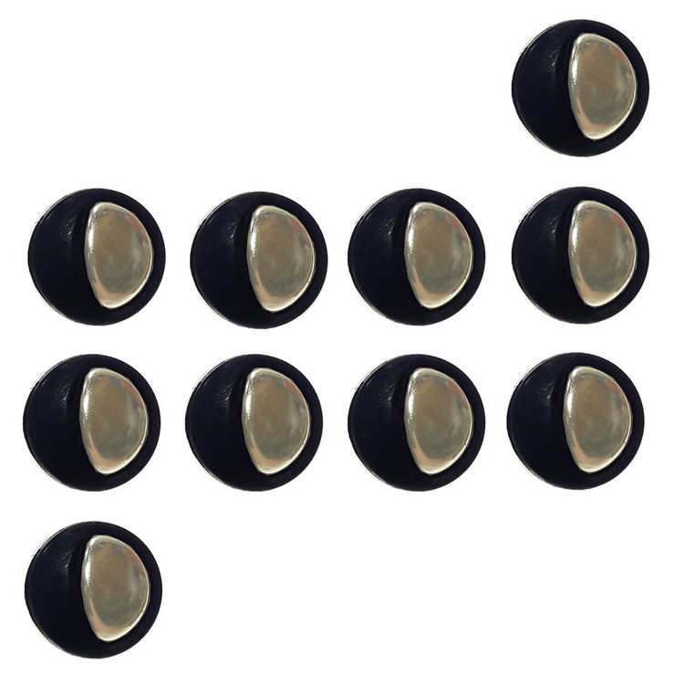 10 عدد دکمه پایه دار با قطر 1.8 و ضخامت 1 سانتی متر رنگ مشکی_طلایی روشن طبق عکس.برای بهتر دیده شدن کالا از بزرگنمایی استفاده شده لطفا به ابعاد دکمه دقت بفرمایید.
