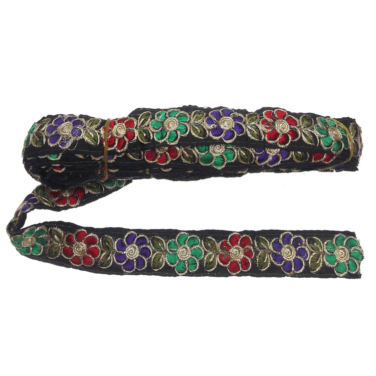 1.75 متر یراق سنتی با عرض حدود 3.5 سانتی متر.گلدوزی شدخ با رنگ های قرمز_بنفش_سبزآبی و برگ های سبز.زمینه کار مشکی.مناسب تزئین مانتو و لباس سنتی کیف و دکور های سنتی