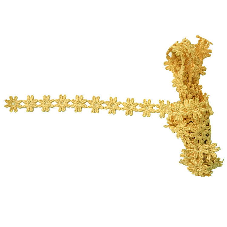 200 سانتی متر یراق گیپور گل کرم طلایی.ابعاد گل ها 1.8x1.8 سانتی متر است.حدود 120 گل در این متراژ وجود دارد که می توان به صورت تک تک یا نواری روی کار تزئین کرد