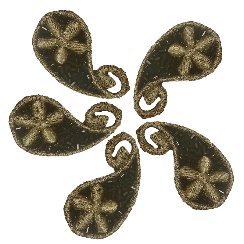 5 عدد استیکر بته جقه اتویی با ابعاد 2.5x4.5 سانتی متر.رنگ زمینه مشکی با نخ لمه طلایی روشن و ملیله شکسته مشکی.مناسب تزئین لباس مانتو کیف کفش و غیره