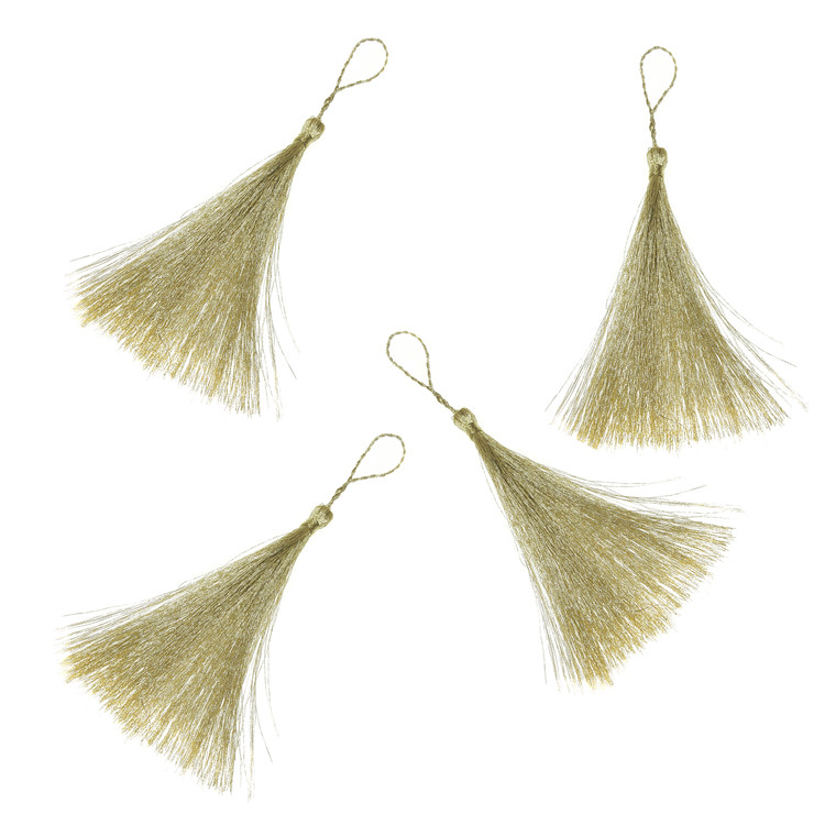 ۴ عدد منگوله طلایی جنس لمه.طول بند حدود ۴ سانتی متر و قد منگوله حدود ۱۰ سانتی متر.مناسب تزئینات لباس ، مانتو ، رومیزی ، عروسک سازی و ...