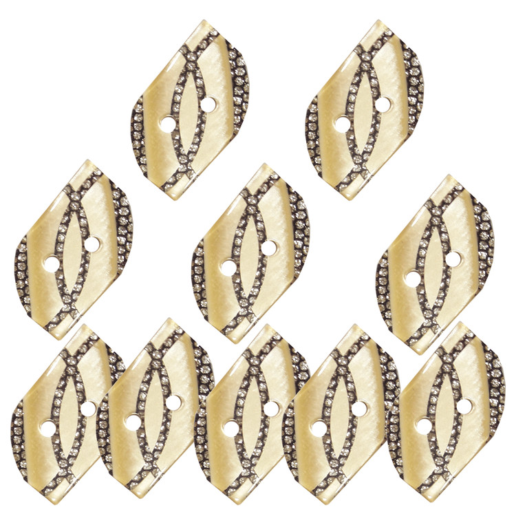 10 عدد دکمه صدف سایز 3.7x2.2 و ضخامت 0.5 سانتی متر.رنگ کرم_نقره ای و طرح طبق عکس.مناسب پالتو مانتو مجلسی و غیره.لطفا به ابعاد دکمه دقت بفرمایید.