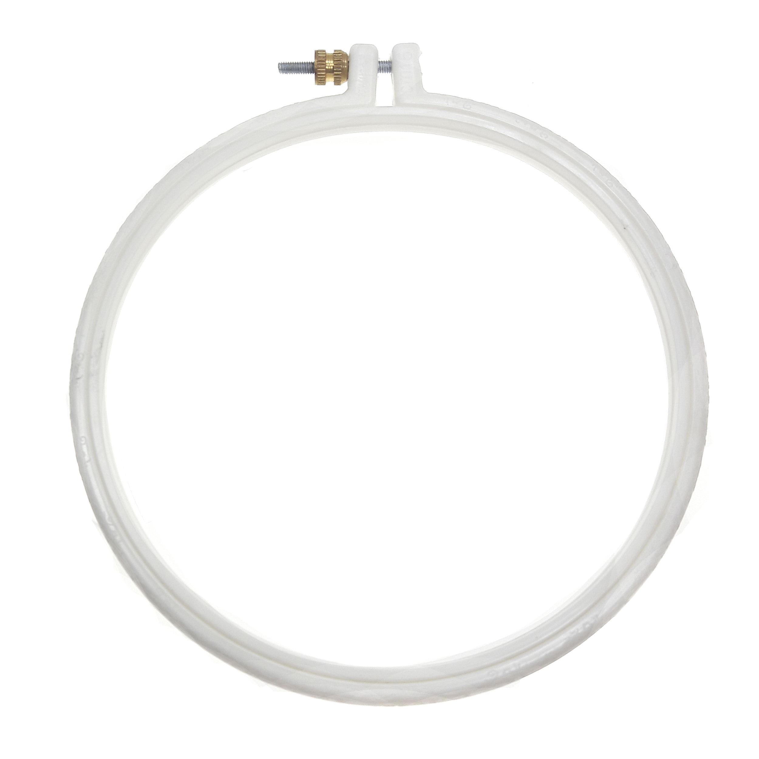 کارگاه گلدوزی سایز 12 سانت رنگ سفید.روی بدنه کارگاه طرح داره.وسیله ای برای ثابت و محکم کردن پارچه است تا سوزن دوزی بر روی پارچه به راحتی انجام شود.