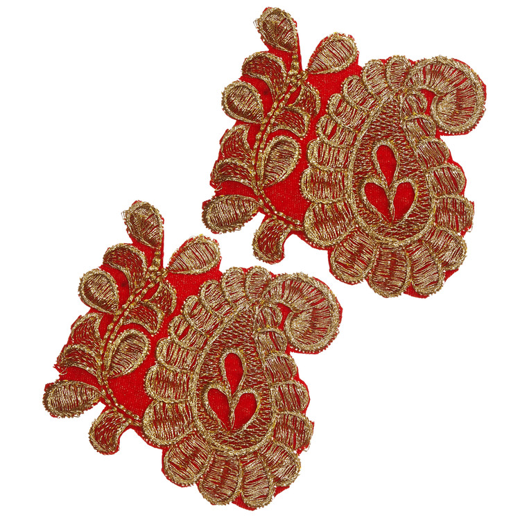 2 عدد تکه دوزی رنگ زمینه قرمز با نخ لمه طلایی گلدوزی شده ابعاد حدود 8x7.5 سانتی متر.مناسب تزئینات لباس مانتو و کارهای سنتی