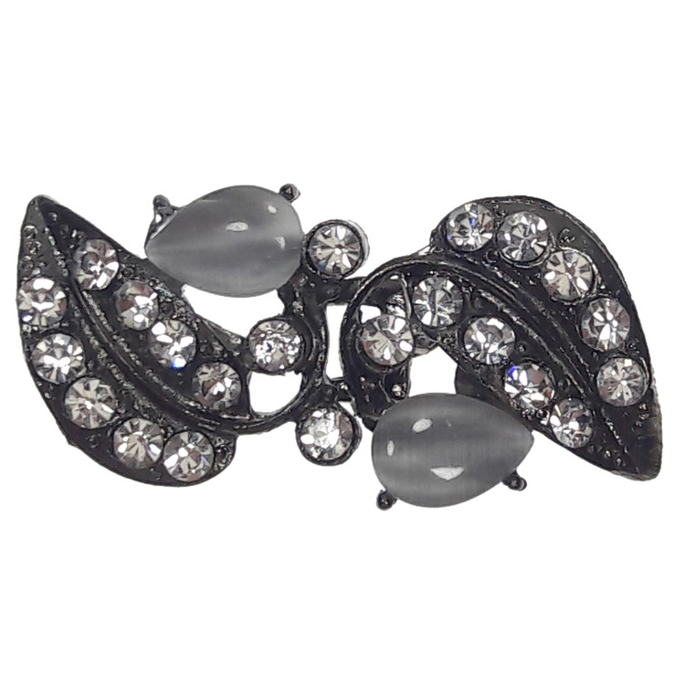 یک عدد دکمه جفتی نگین دار فلزی دوختنی با ابعاد ۴x۲ سانتی متر.رنگ بدنه مشکی دودی با نگین نقره ای و نگین های اشکی طوسی طبق عکس ارسال می شود.بسیار شیک مناسب کت و مانتو مجلسی.این دکمه به صورت نر و ماده مثل قزن به هم متصل می شود و نیازی به جا دکمه ندارد.لطفا به ابعاد دکمه دقت بفرمایید.