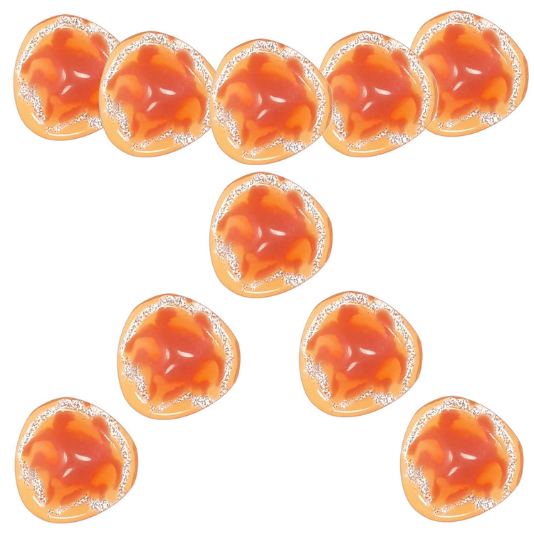10 عدد دکمه با قطر 2 سانتی متر ضخامت حدود 0.7 سانتی متر طرح و رنگ مطابق عکس.نارنجی با رگه نقره ای.مناسب لباس مانتو و غیره.لطفا به ابعاد دکمه دقت بفرمایید.