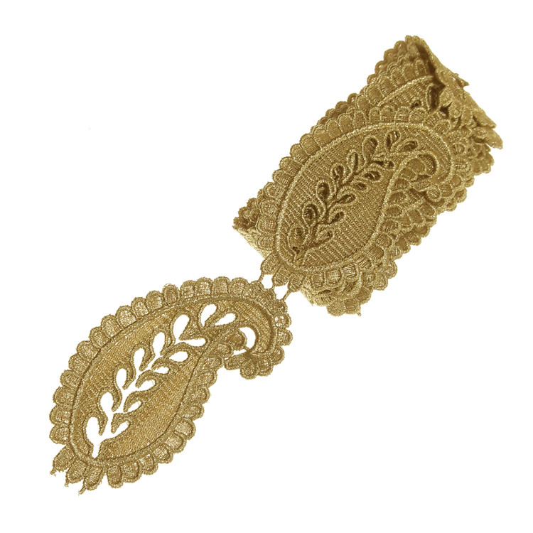 2 متر یراق بته جقه طلایی لمه براق با عرض حدود 5.5 سانتی متر مناسب تزئینات کت مانتو لباس کیف و کارهای هنری.طرح و رنگ طبق عکس.حدود 18 عدد بته جقه در این متراژ وجود دارد که می توان به صورت تک تک یا نواری استفاده کرد.در صورت نیاز قبل از استفاده یک پارچه روی یراق قرار داده و اتو کنید.