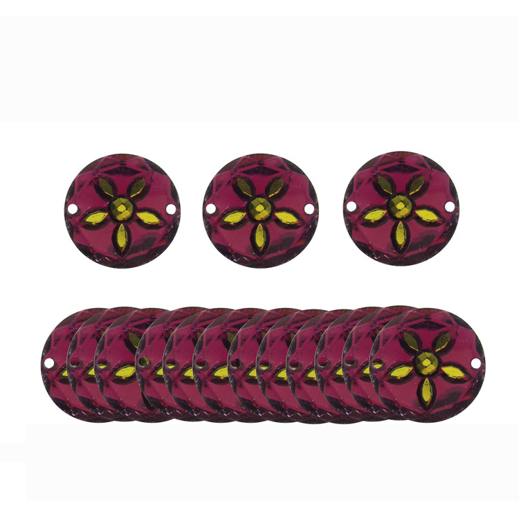 یک بسته 15 عددی نگین بنفش وسط طلایی دوختنی با قطر 2 و برجستگی 0.5 سانتی متر جنس با کیفیت خوب و براق.مناسب تزئین لباس و کارهای هنری مجسمه سازی عروسک سازی و ساخت بدلیجات گل سر تل سر و غیره