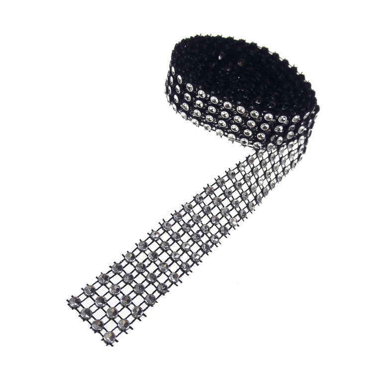 1.1 متر نوار طرح نگین 4 ردیفه با عرض 2 سانتی متر رنگ مشکی نقره ای.مناسب تزئینات لباس مانتو کیف کفش جعبه تل گل سر شانه کارهای هنری و سنتی.قابلیت برش به ردیف های کمتر را دارد.