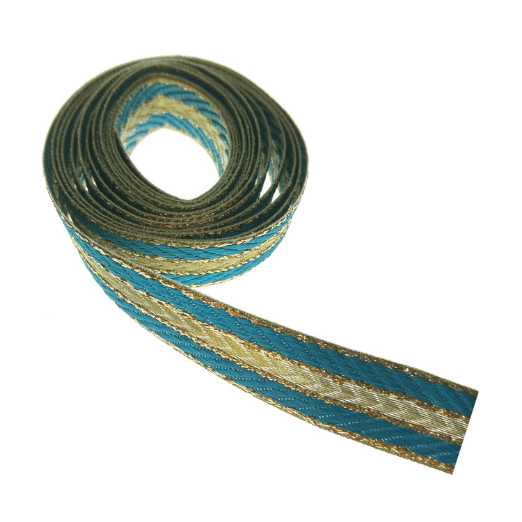 2.5 متر نوار تزئینی لمه با عرض حدود 2.2 سانتی متر طرح و رنگ طبق عکس.رنگ آبی زنگاری_طلایی.مناسب تزئینات لباس مانتو کیف کارهای هنری و سنتی.