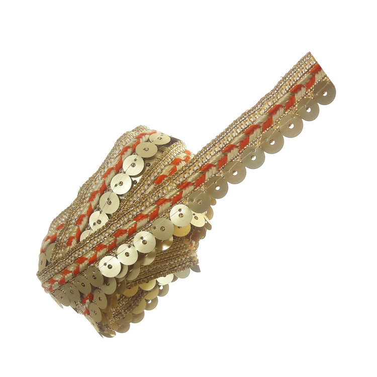 3 متر نوار تزئینی پولکی لمه با عرض حدود 2 سانتی متر طرح و رنگ طبق عکس.رنگ نارنجی_طلایی روشن.مناسب تزئینات لباس مانتو کیف کارهای هنری و سنتی.این نوار به حالت مغزی بین درز لباس و مانتو هم دوخته می شود.