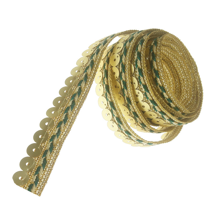 3.6 متر نوار تزئینی پولکی لمه با عرض حدود 2 سانتی متر طرح و رنگ طبق عکس.رنگ سبز آبی تیره_طلایی روشن.مناسب تزئینات لباس مانتو کیف کارهای هنری و سنتی.این نوار به حالت مغزی بین درز لباس و مانتو هم دوخته می شود.