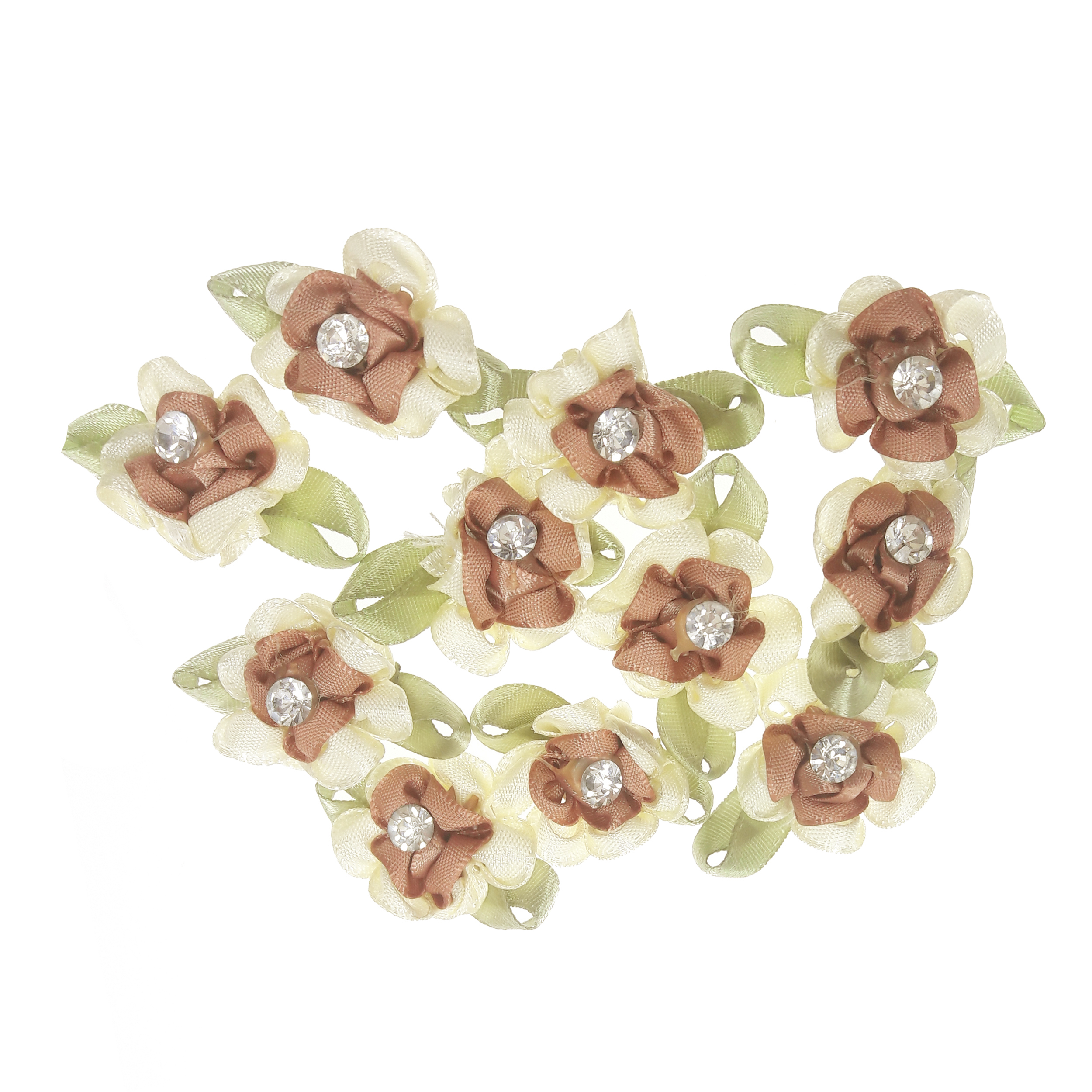 سایر توضیحات: 10 عدد گل تزئینی نگین دار با ابعاد حدود 2.5x2.5 سانتی متر طرح و رنگ طبق عکس.قهوه ای مسی_شیری با برگ سبز و نگین نقره ای.مناسب تزئینات لباس کیف کفش گل سر تل شنیون تزئینات هفت سین جوراب شال عروسک و غیره