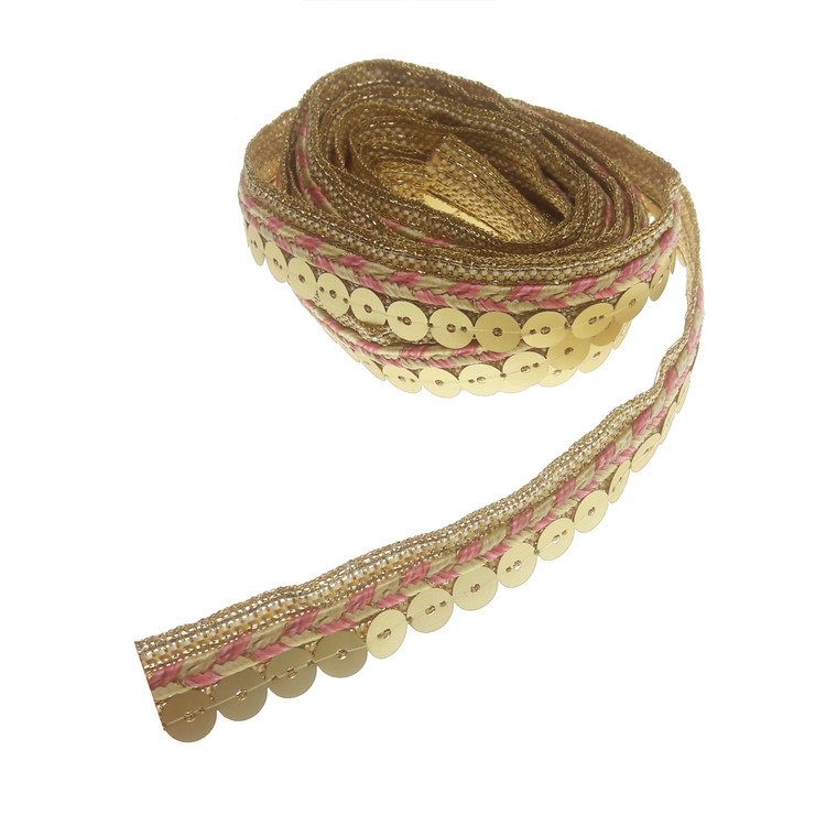 1.9 متر نوار تزئینی پولکی لمه با عرض حدود 2 سانتی متر طرح و رنگ طبق عکس.رنگ صورتی_طلایی روشن.مناسب تزئینات لباس مانتو کیف کارهای هنری و سنتی.این نوار به حالت مغزی بین درز لباس و مانتو هم دوخته می شود.