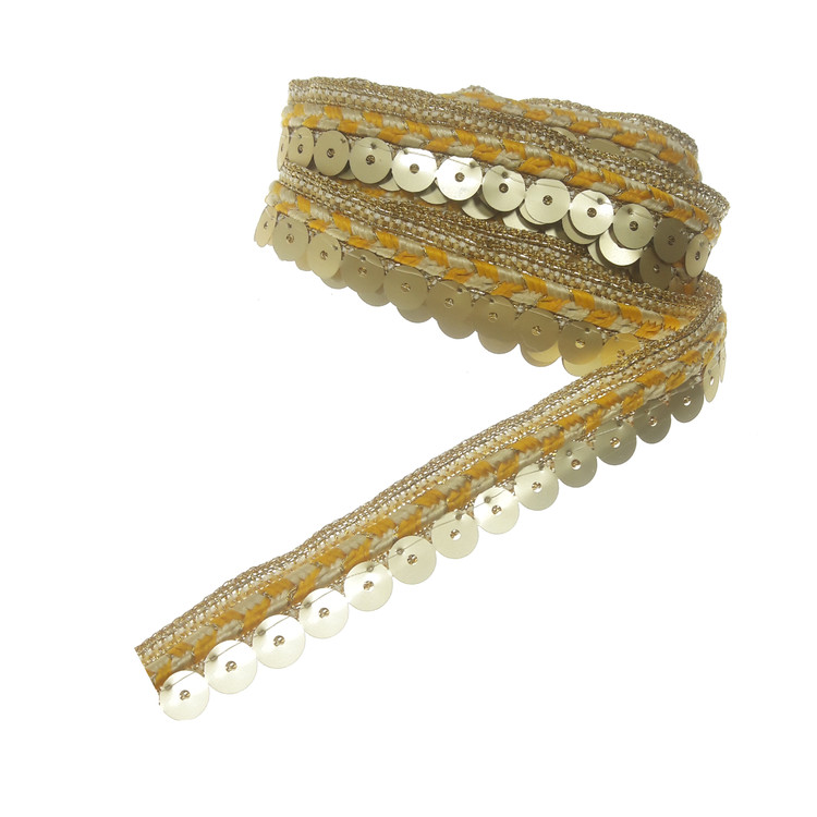 3 متر نوار تزئینی پولکی لمه با عرض حدود 2 سانتی متر طرح و رنگ طبق عکس.رنگ نارنجی کم رنگ_طلایی روشن.مناسب تزئینات لباس مانتو کیف کارهای هنری و سنتی.این نوار به حالت مغزی بین درز لباس و مانتو هم دوخته می شود.