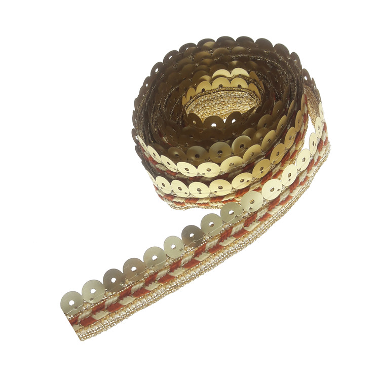 0.8 متر نوار تزئینی پولکی لمه با عرض حدود 2 سانتی متر طرح و رنگ طبق عکس.رنگ آجری_طلایی روشن.مناسب تزئینات لباس مانتو کیف کارهای هنری و سنتی.این نوار به حالت مغزی بین درز لباس و مانتو هم دوخته می شود.