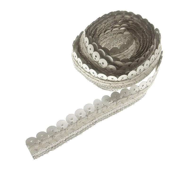 3.5 متر نوار تزئینی پولکی لمه با عرض حدود 2 سانتی متر طرح و رنگ طبق عکس.رنگ سفید_نقره ای.مناسب تزئینات لباس مانتو کیف کارهای هنری و سنتی.این نوار به حالت مغزی بین درز لباس و مانتو هم دوخته می شود.