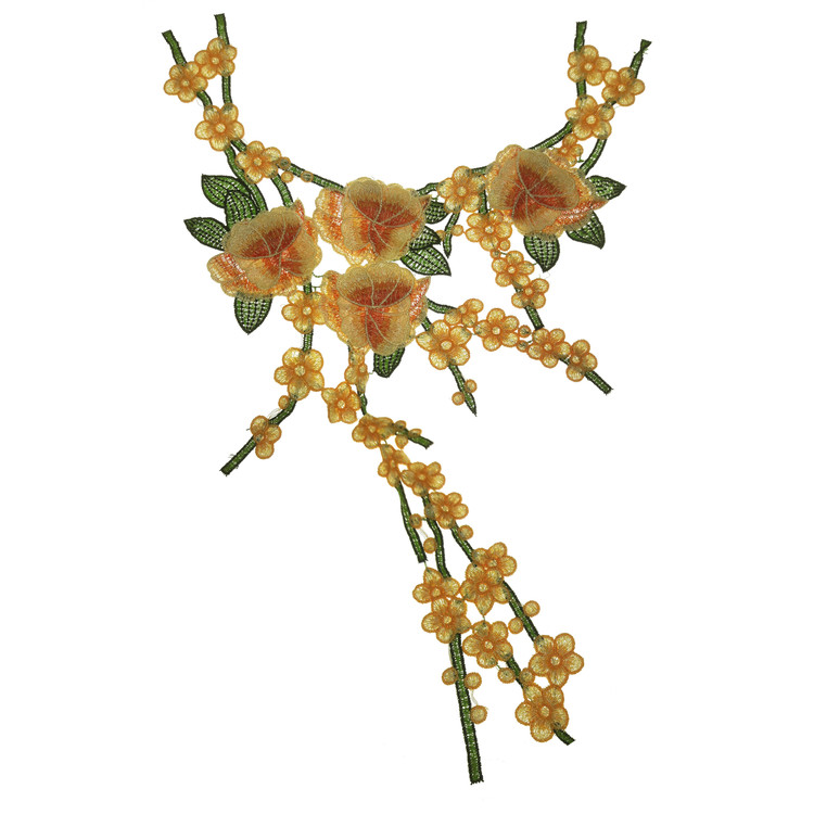 1 عدد پنل مناسب یقه لباس با ابعاد حدود 32*60 سانتی متر.گلدوزی با نخ ابریشم رنگ گل ها زرد_نارنجی برگ سبز .به ابعاد یقه در عکس دوم دقت بفرمایید.