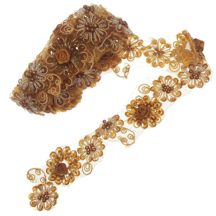 یراق کار شده طول 2.2 متر با عرض حدود 3 سانتی متر.رنگ قهوه ای روشن.مناسب تزئین کت دامن شال و سایر کارهای هنری