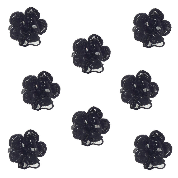 یک بسته 8 عددی گل مشکی با آویز مروارید.با ابعاد حدود 5*5 سانتی متر.مناسب تزئین لباس و کارهای هنری مجسمه سازی عروسک سازی و ساخت بدلیجات گل سر تل سر و غیره