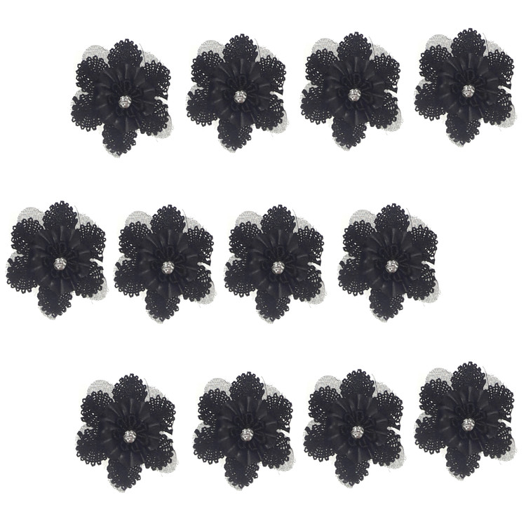 یک بسته 12 عددی گل مشکی با نگین نقره ای..با ابعاد حدود 3.5*3.5 سانتی متر.مناسب تزئین لباس و کارهای هنری مجسمه سازی عروسک سازی و ساخت بدلیجات گل سر تل سر و غیره