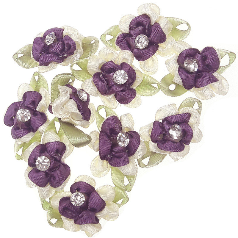 سایر توضیحات: 10 عدد گل تزئینی نگین دار با ابعاد حدود 2.5x2.5 سانتی متر طرح و رنگ طبق عکس.بنفش بادمجانی روشن_شیری با برگ سبز و نگین نقره ای.مناسب تزئینات لباس کیف کفش گل سر تل شنیون تزئینات هفت سین جوراب شال عروسک و غیره