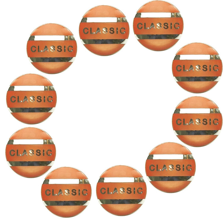 10 عدد دکمه پایه دار با قطر 2 سانتی متر ضخامت حدود 1 سانتی متر طرح و رنگ مطابق عکس.نارنجی و خط و نوشته با رنگ نقره ای براق.مناسب لباس مانتو و غیره.لطفا به ابعاد دکمه دقت بفرمایید.